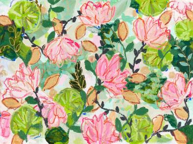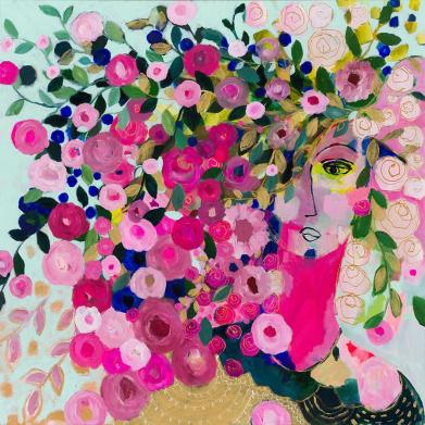 CS: My art has been called floral expressionism. I call it an act of pure wild ecstatic blissful love, but I’m not sure that is considered a genre yet—ha! I paint mostly loose flowers with an abundance of saturated color and feminine faces.