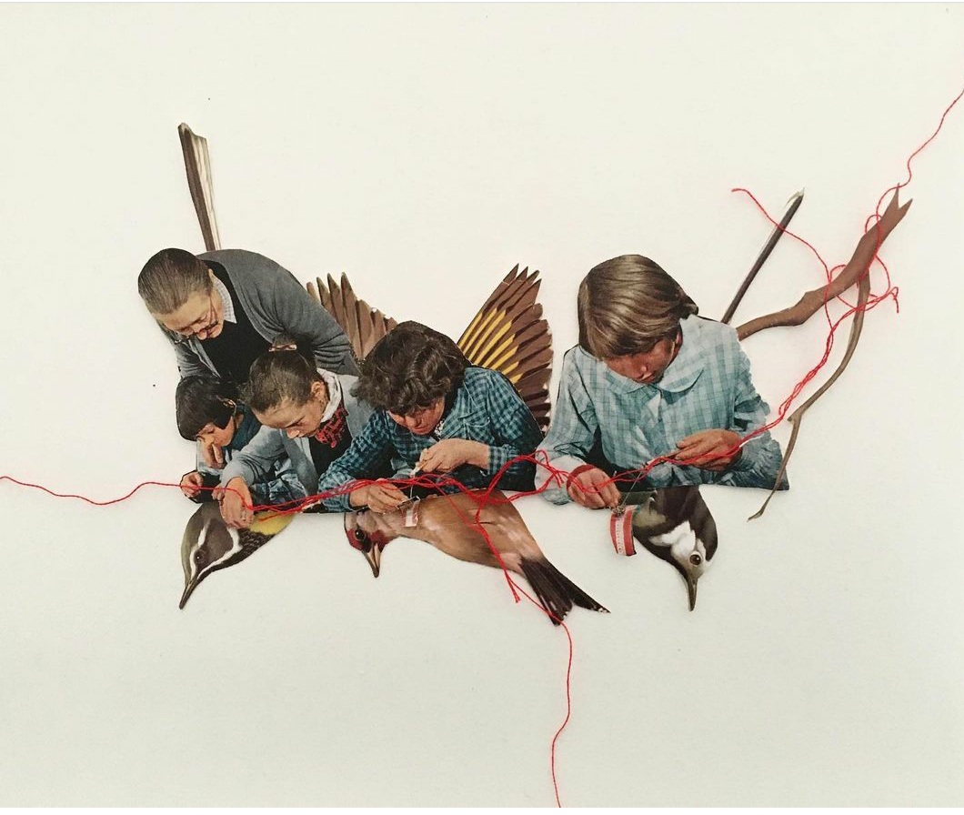 RF: I would categorize my work as analog collage. I use found ephemera, generally vintage, and incorporate the use of thread and marking.