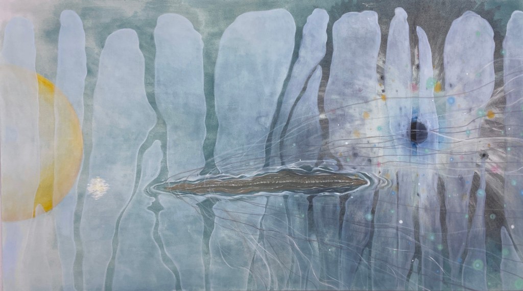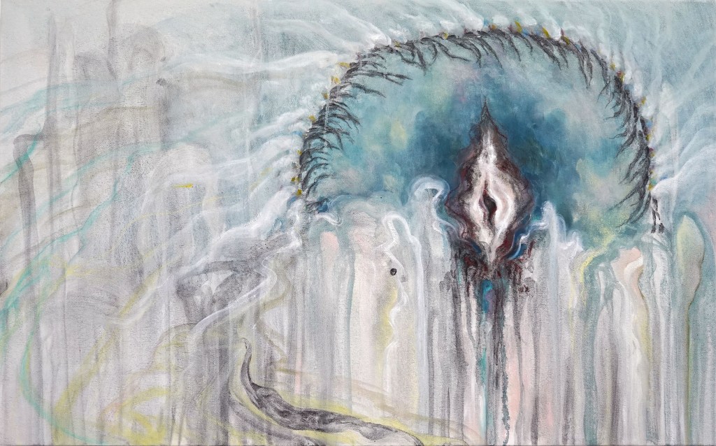 XY: My works combine the Japanese tradition of portraying nature and water as a medium to spirituality, with illusions to death in the form of motifs, such as the centipede that feeds on dead organisms, and hues which remind myself, and hopefully the viewer, of nature’s odors, including that of humidity and death. In a way, my paintings could be called 21st century vanitas paintings. In reminding the viewer of death and the afterlife, and memories and fear associated with them, the viewer is called to explore their spiritual dimension in the face of their own death.