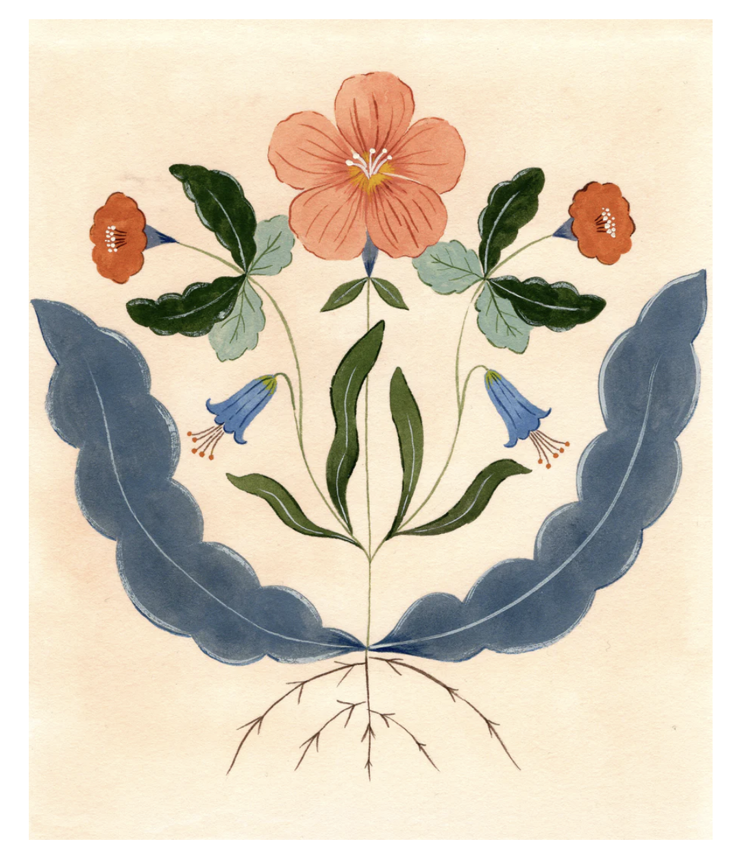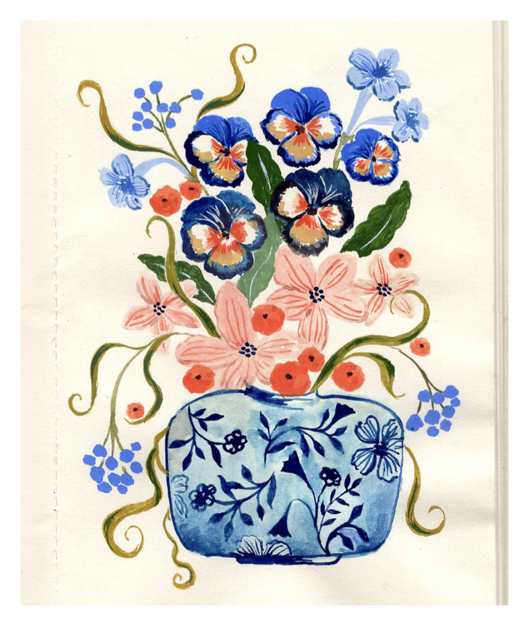 FW: I will start by choosing my subject matter (looking at inspirational photos I may have taken or lists of ideas) and I will begin sketching small thumbnails in pencil in my notebook. This sketch process is quick, but it really helps to refine the details of the painting such as composition and shapes to feel out what is working together. I rarely start a painting without some form of a sketch. As I draw I think about the colour palette; this is often derived from colours I am currently enjoying, or a specific group of colours I may have seen somewhere which excites me. I will create swatches of these colours to see how they look side by side and all the time I am thinking about how they will come together in the painting and what will be placed where. I trust my intuition from this point on as I work on the painting, but this is usually how I start my work.